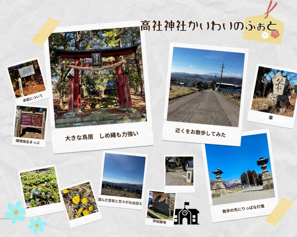 ここは「かいわい」を堪能してください。天気の良い日のお散歩がおすすめです。「高社神社」の立派な鳥居をくぐるとマイナスイオン満載の木々に囲まれます。そこには「赤岩」という名前の岩があったり、昔なつかしいゴンドラ型のブランコがありました。著者が小さい頃にがったんがったんになるまで漕ぎ倒したブランコです。写真撮り忘れてしまいましたのでご想像ください。